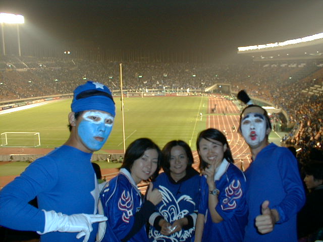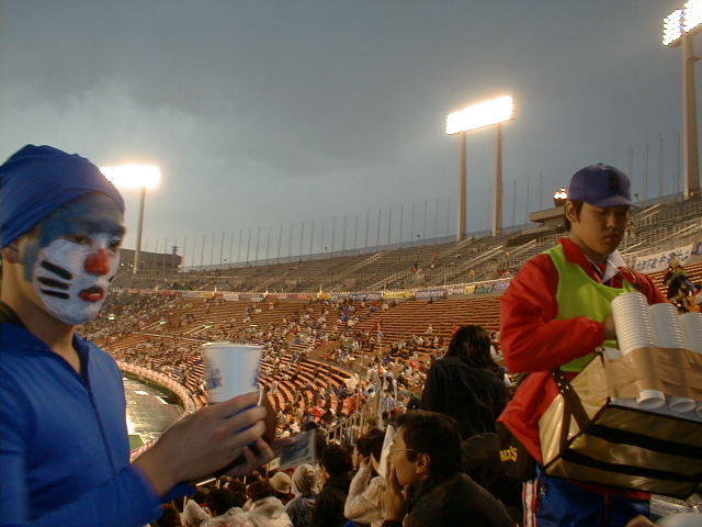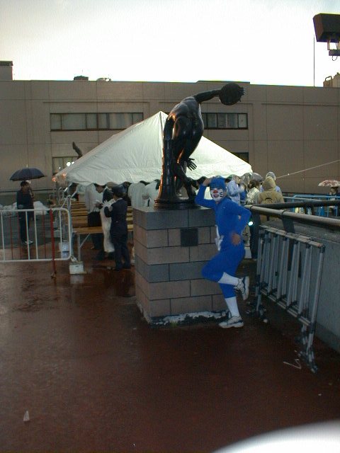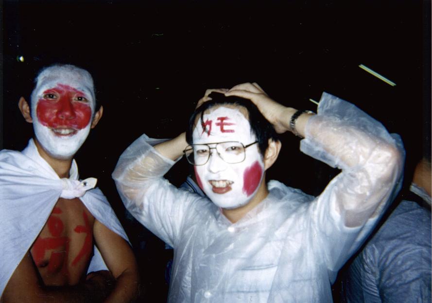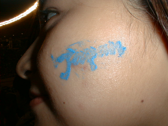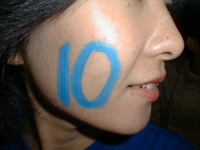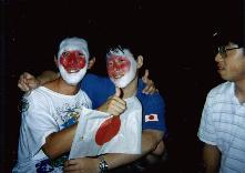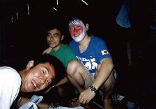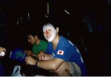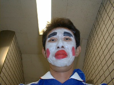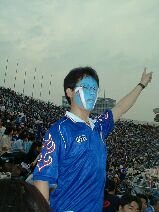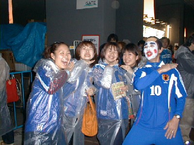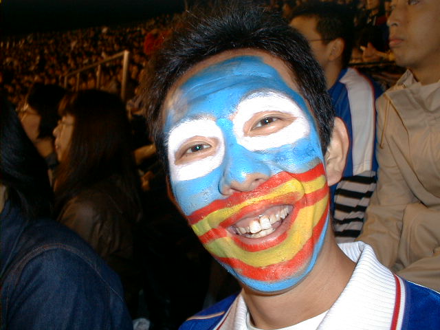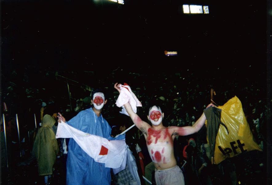 なんと、後半開始早々どしゃ降りの雨がスタジアムを襲った!言ってみればマカオーネパール戦などどうでも良い試合、雨に降られてまで見る試合ではない。ということで先ほどまでボケーっと試合をみてた奴等がどどーっと通路に流れ込んできたからさーたいへん。たちまち俺達はちょー注目の的になってしまった。しかし、ここで引き下がるわけにも行かず、人目を気にせずペインティング続行。そしておれときっぺーのペインティングが終了したところで、皆同じペインティングではつまらないという考えがふつふつと湧いてきて...