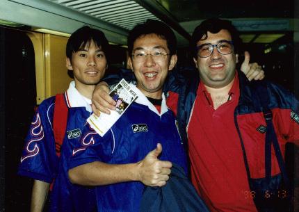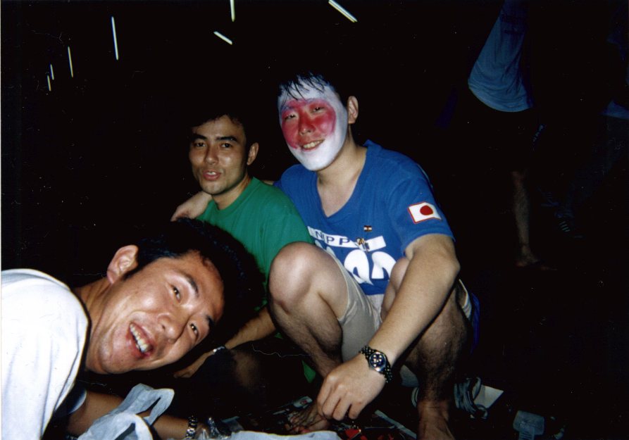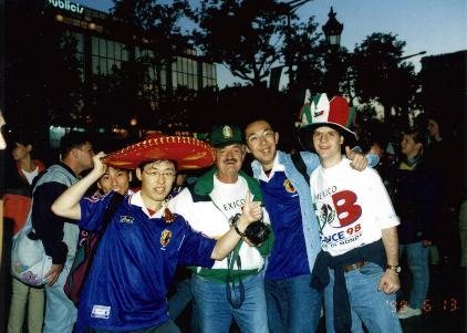 まず、以下の写真を見ていただきたい。これは、1998年のFRANCE W-CUPに先立ち1997年にフランスで開催されたプリワールドカップの時の写真である。俺達(あえて達をつけたのはこのサッカー観戦旅行が新婚旅行だったからだ。)はイタリアVSブラジル戦 フランスVSイタリア戦 フランスVSイングランド戦の計3試合を観戦した。真中で幸せそうなアホ面をしているのが俺だ。背中ではなく腹の方にバッグを持ってきてるのがちょっとマヌケ。説明の必要はないとはおもうが、その両サイドでポーズを取っているのがかの悪名高きフーリガンだ。しかし、彼らはとても紳士だった。はじめに出会ったのはトイレの中だったが、順番を譲ってくれたし、写真撮影にも気軽に応じてくれた。なのに、彼らフーリガンはスタジアムの一箇所に集められ、しかも彼らの周りを防護ネットでぐるりと取り囲まれていた。まるで、檻の中で飼われている二十日ねずみみたいな感じだったのを覚えている。彼らはその檻の中でペットショップボーイのGO WESTGO WESTという歌詞のところをENGLISHに替えた替え歌を歌っていた。(日本代表の応援歌にもなったがこちらが本家)