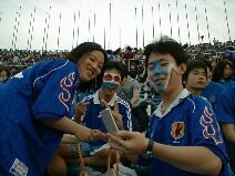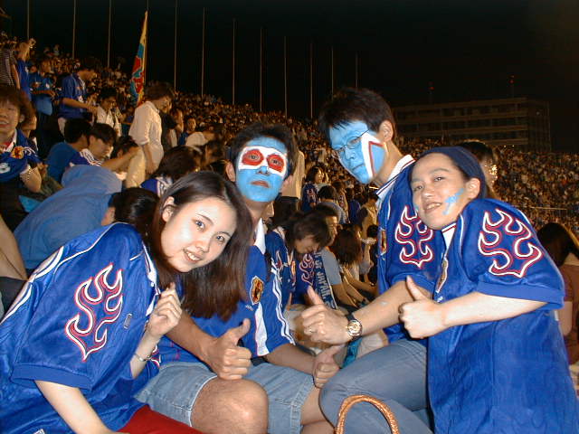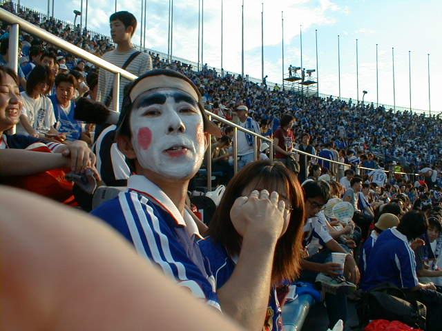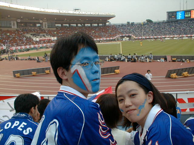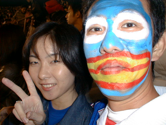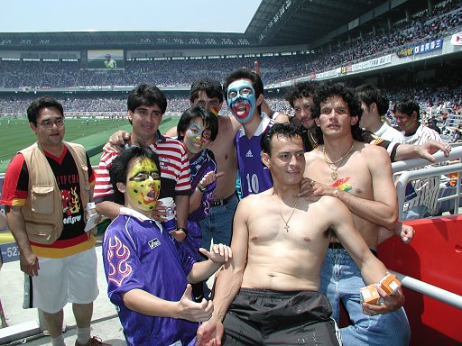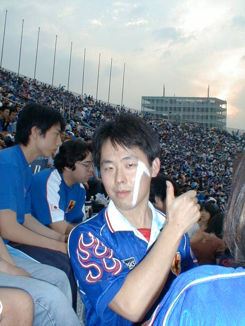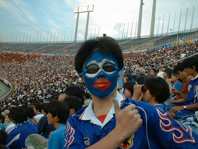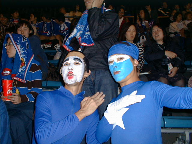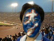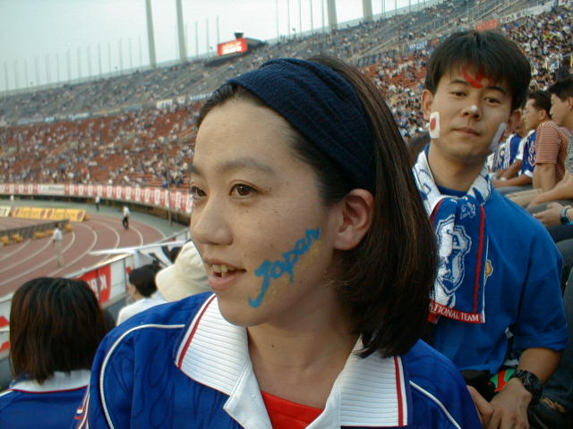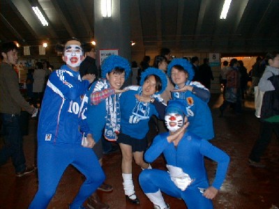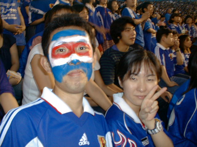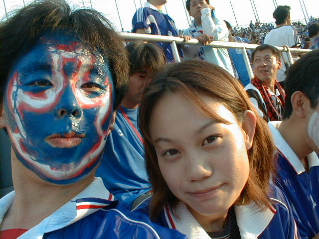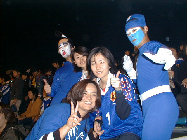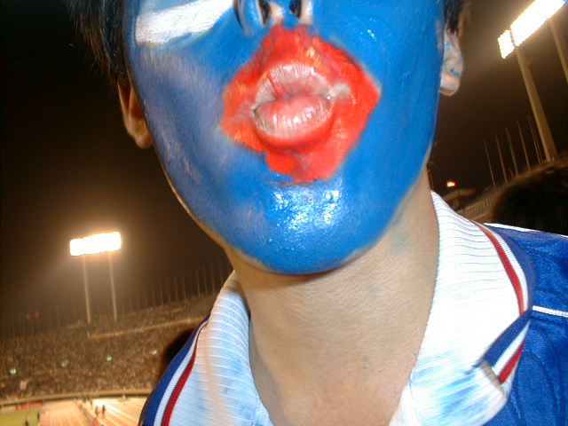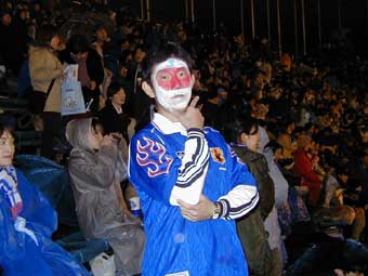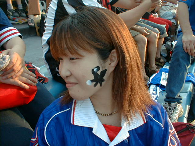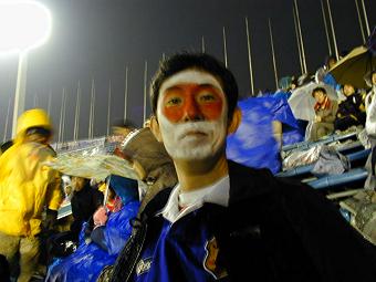 今日はいろいろ忘れた。まずは全身タイツ、次にづら!これでバカとのはできず。。。(涙)ついでにデジカメも忘れてしまった。(だから今回は画像が少ない!)さらに、決定的なものを忘れた。それはチケット!(号泣)しかし、スタジアムの友人達の積極的なチケット捜索活動のおかげでなんとかスタジアムに入れました。みなさんありがとう!(これで、2002も大丈夫だな。←本当か?)世の中、女性の進出が目覚しいが、とうとうペインティングサポーターの世界にも本格的に参加したいという気合の入った女性が現れました。ありがたいことです。大事に育てたいと思います。皆さんも、2002の彼女に期待しておいてください。