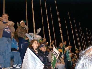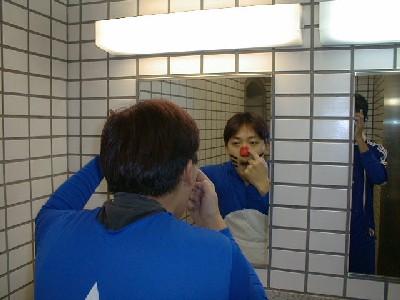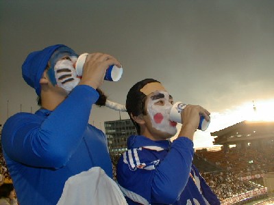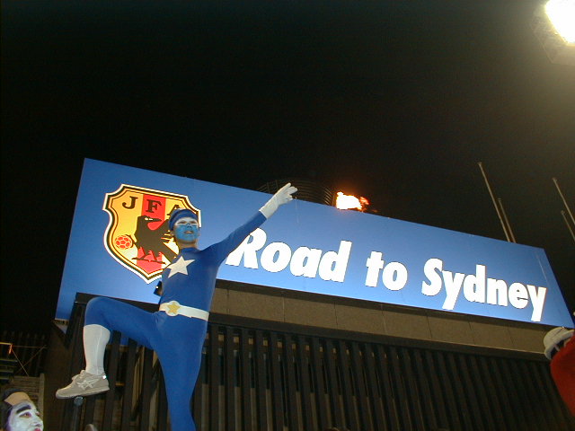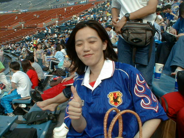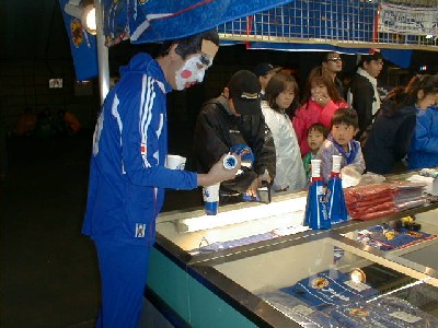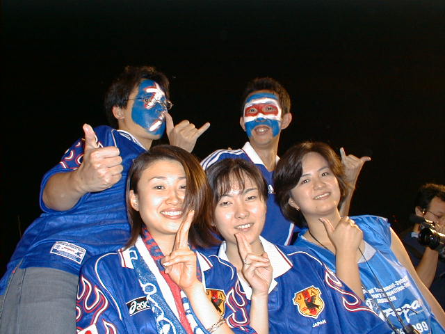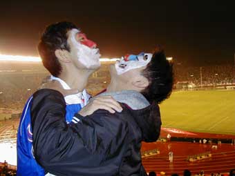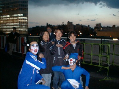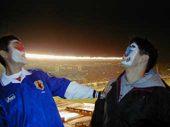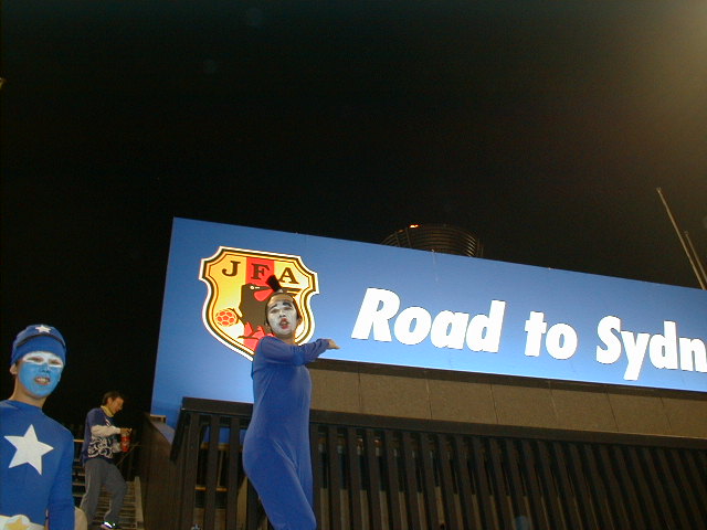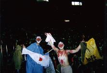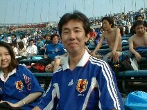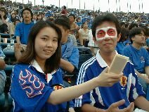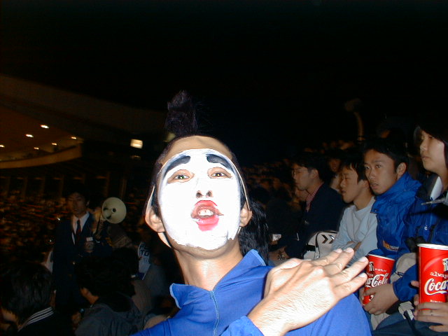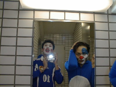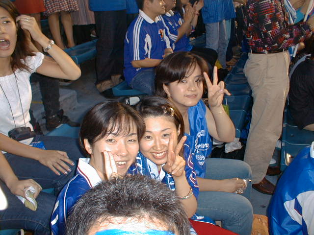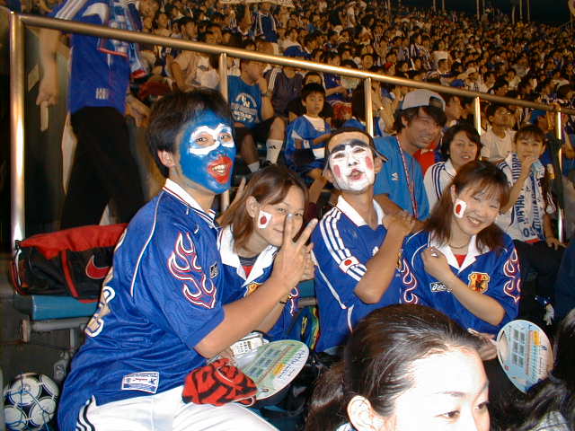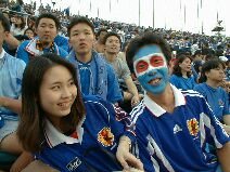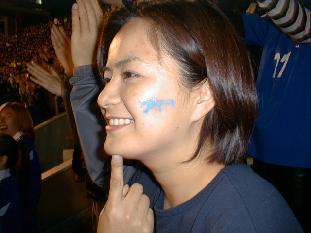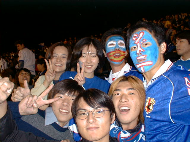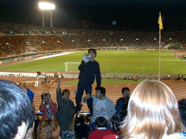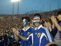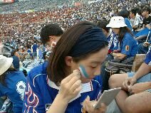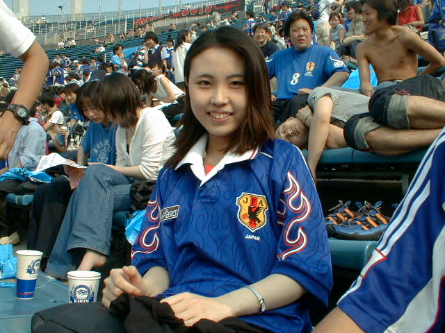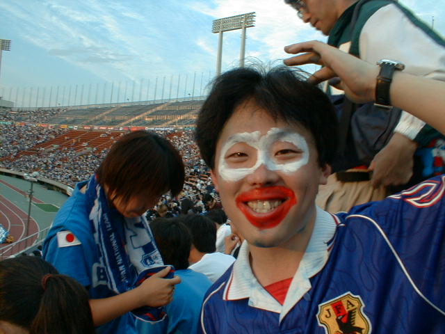 今日はいろいろ忘れた。まずは全身タイツ、次にづら!これでバカとのはできず。。。(涙)ついでにデジカメも忘れてしまった。(だから今回は画像が少ない!)さらに、決定的なものを忘れた。それはチケット!(号泣)しかし、スタジアムの友人達の積極的なチケット捜索活動のおかげでなんとかスタジアムに入れました。みなさんありがとう!(これで、2002も大丈夫だな。←本当か?)世の中、女性の進出が目覚しいが、とうとうペインティングサポーターの世界にも本格的に参加したいという気合の入った女性が現れました。ありがたいことです。大事に育てたいと思います。皆さんも、2002の彼女に期待しておいてください。