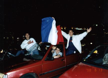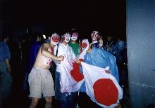 シャンデリゼに着くと、周りはワールドカップ一色!何処で騒ごうかと、俺達の目は泳ぎっぱなしである。そして、シャンデリゼで一番目立ってる奴等発見!その数2,3百人。完全にオランダサポがシャンデリゼ通りを占拠していた。早速そいつらの集団の中に入っていく。奴等はでかいでかい。身長183cmの俺が入っていってもすべて目線は上になっている。(写真1写真2参照)こいつらが暴れだしたらどうしようもないよほんとに。 2002ではスタの警備のボランティアを狙ってるおれとしては、こいつらの弱点を把握しとかねば...と思ってると周りの奴等が思いもよらぬ行動に出た。なんと俺達に向かって手を合わせ出したのだ。さらに、そばで仲間に入りたそうに様子を見ていたにいたドンタコスで有名なメキシカン達やアルゼンチン人と一緒になってやりだしている。奴等に言わせれば「俺達はジャポン→ジャポンは東洋の神秘の国&仏教の国→ゆえに拝むべし。」(ジャポン第一の法則)と、こういう事らしい。すかさず、俺達は釈迦如来の格好をしたのは言うまでもない。こうして、意気投合記念撮影とあいなりました。