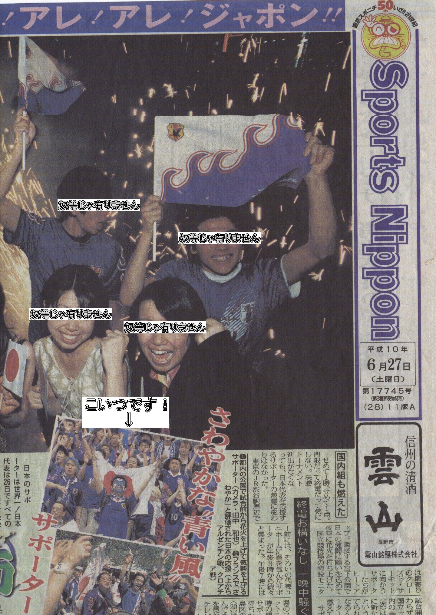 一通りの自慢も終わったので場所を移そう。今度はスタジアムで目立とう!トゥールーズのスタジアムは川の中州にある。この中州に渡る為にはチケットが必要らしい。早速渡し舟に乗って中州に到着。みんなの集まってそうな所を探す。すると間もなく、あったありました。みんなうじゃうじゃいます。ここには地元テレビ局しかいないみたいだ。でも騒ごうともに歌おう!  そしてついに。日本代表がW-CUPの舞台に立つ歴史的瞬間の数時間前に、俺達の歴史的瞬間は来た!!!これは報知新聞の裏一面の画像だが、一面を飾っていた中田よりもでかく載っていた!この日を、俺達が中田を超えた、中田超記念日と名付けよう。(帰国後の調査の結果、俺達の快進撃は報知新聞にとどまらず、スポニチやW-CUPサポーターが掲載されている雑誌4,5紙には載っていた気がする。もちろんのことテレビにも出まくってたらしい。キャピタル広場でアルゼンチンの雑誌社からインタビュー&写真を取られ、出来あがった雑誌を送ってくれるはずだったが未だに届かず。)あ、そうそう、きっぺーは会場入りのボディチェックで、アホなことに、奥さんのプレゼントで、今回の旅で絶えず携帯していたナイフを持ち込もうとして捕まった。そして、ナイフを取り上げられた挙句、かばんをひっくり返されくまなくチェックされたマヌケな一幕も有ったことを付け加えておこう。トゥールーズ写真集   その後、俺達はカンヌで一時のバカンスを楽しんだ後、子供が産まれそうなのでクロアチア戦のチケットを川瀬&きっぺーに託し一人帰国の途に就いた。川瀬ときっぺーはその後も順調な活躍を続け、とうとう世界で一番有名であろうサイトwww.france98.comに掲載されたのだ!(ページの中の"Kenji"がきっぺーです。)これが載った事でとりあえず世界のペインティングサポーターのリーダーになれた事にする。  既に報知新聞が回覧されていた職場に帰った俺達がヒーローになっていたことはいうまでもなかろう。(俺達が職場に戻ってきたときは、まるでフランスに凱旋帰国した皇帝ナポレオンのようでした。:友人談)  以上、楽しんで頂けただろうか。最後まで読んでくれたお礼にカンヌのビーチ(ク)の写真をサービスしよう。(カンヌは、というか南仏はトップレスが基本です。見えにくいですが、左端に写ってるのがきっぺーの肩です。)