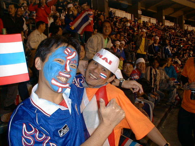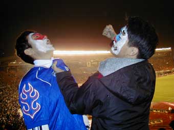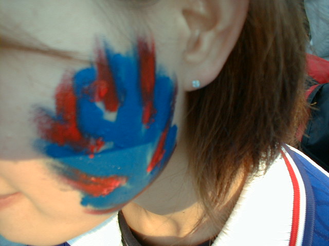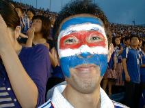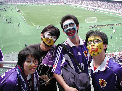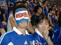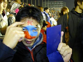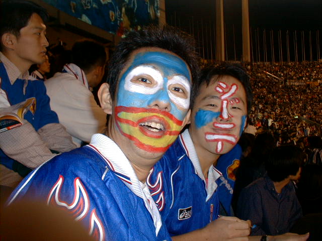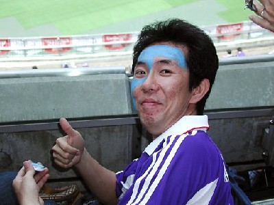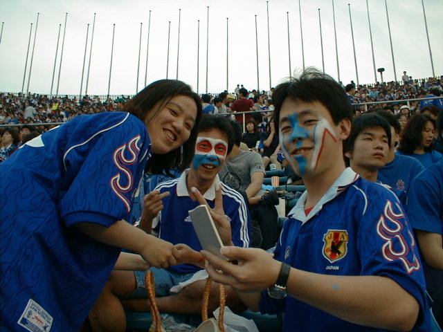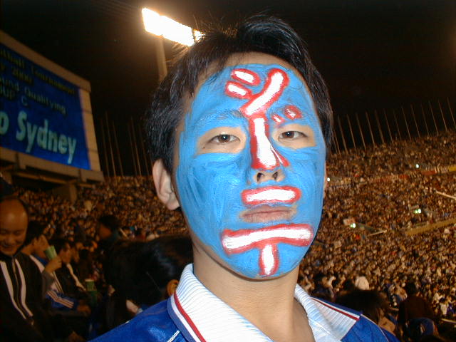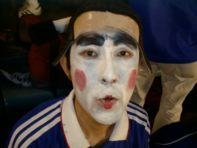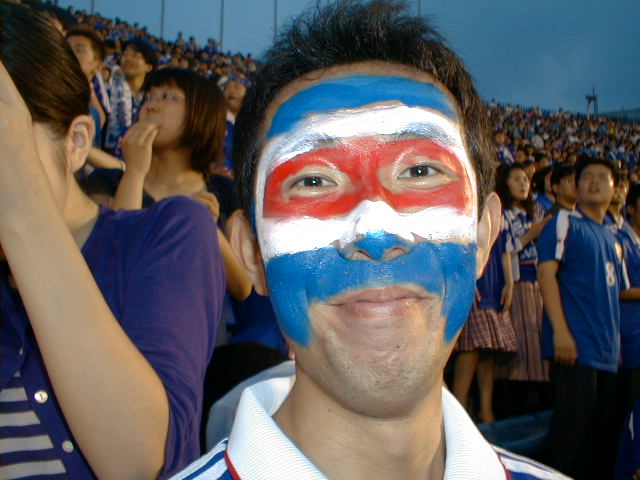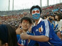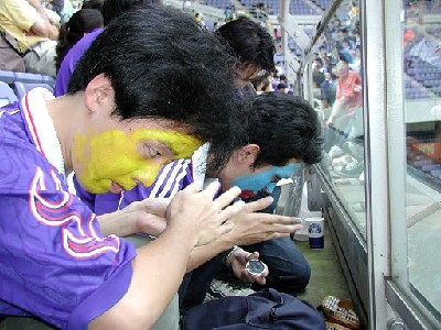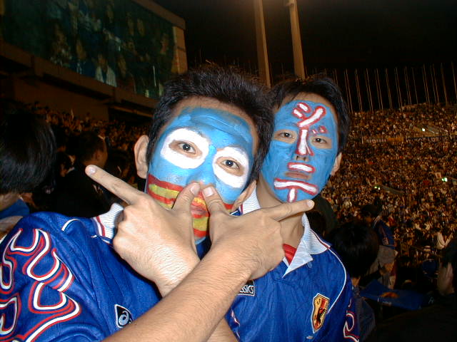 よし、ペインティングだ。赤白青というペインティンググッズを前にしてはもう三色旗しかないだろう。という結論に達するのにそれほど時間はかからなかった。急いでトイレに行きペインティングをはじめた。前回のオマーン戦のときは俺達だけだったペインティング姿も今回は結構ちらほら。しかしペインティングでは俺達に一日の長がある。そのほとんどのやつらは前回俺達がやった日の丸ペイントだ。ぷっ。笑ってしまう。常に一歩先をいく俺達が選んだのは三色旗。やっぱまだだれもやってないし、こっちのほうがかっこいい(気がする。)ちょっと鼻高々で俺達はスタンドに向かった。しかし、俺達の気付かないところで、すでに事件は起きていた。