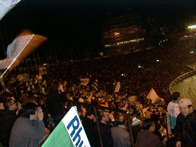 この日は異常に寒かったですが、サポーターの声援は熱かったです。私達のいたゴール裏のサポーターはほとんどの人が立って応援してました。やはり、どんなときでも盛り上がる日韓戦ってとこでしょうか。