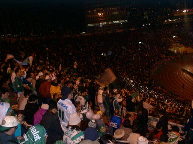 俺達が座った席の周りはパルメイラスサポだらけ ちょっと緊張の張り詰めた異様な雰囲気だった。 こっちもあっちもパルメイラスサポ